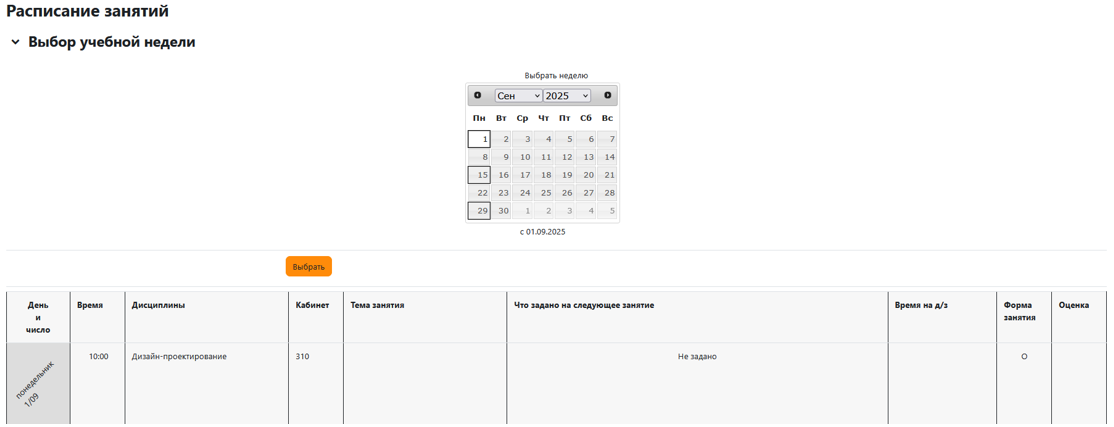 После этого отобразится расписание занятий на выбранную неделю.